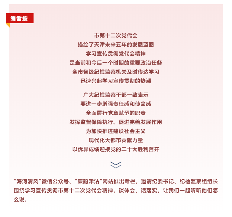 市第十二次党代会是一次高举伟大旗帜、坚定维护核心的大会,是一次立足新发展阶段、贯彻新发展理念、构建新发展格局、引领天津高质量发展的大会。东丽区纪委监委将深刻把握党代会战略部署、任务举措和重要要求,坚守职责定位,着力在“三个强化”上用心用力,积极为加快建设社会主义现代化大都市贡献力量,以优异成绩迎接党的二十大胜利召开。